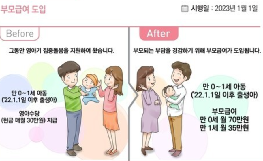 기존에 영아수당으로 매달 1인당 30만 원씩 지급되던 것이 23년부터는 부모급여로 변경됩니다.